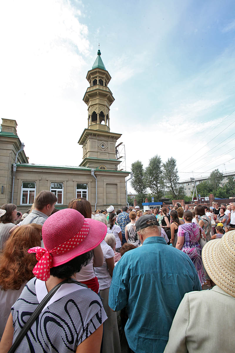 Во дворе старинного здания с полумесяцем на вершине минарета на улице Карла Либкнехта тесно: любители «Прогулок по старому Иркутску» собрались послушать имам-хатыба Фарида Мингалеева, и водителю выезжающей бетономешалки приходится маневрировать крайне осторожно. В мечети идёт реставрация, а рядом строится новое здание духовной школы. Но когда в пёстрой толпе слушателей появляется зелёное одеяние главы мусульманской общины, строительный шум стихает. Из громкоговорителя льётся тихая речь на арабском языке.