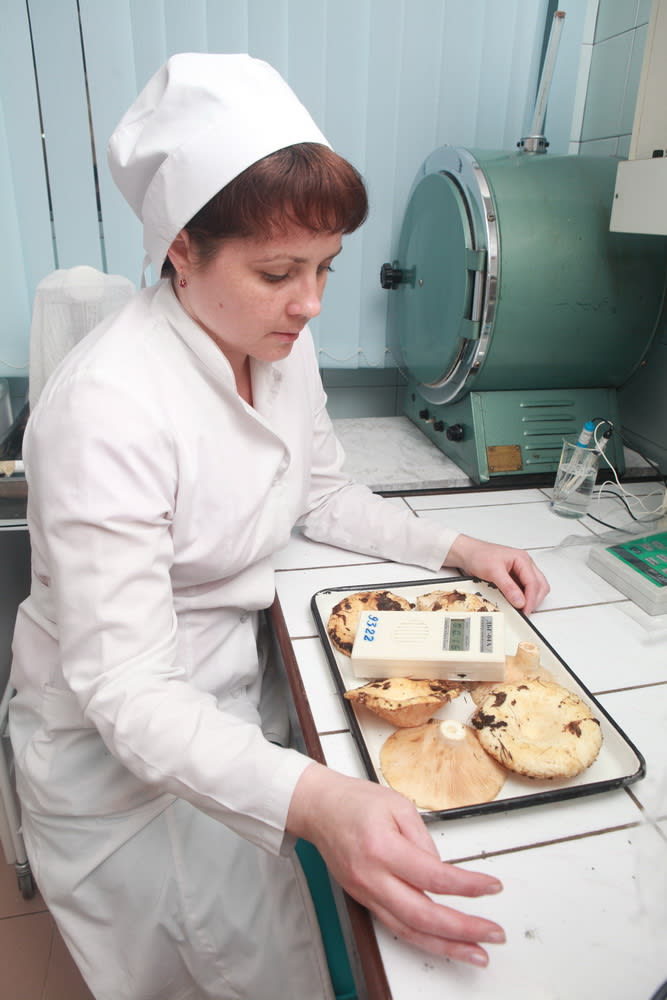 – Ягода как с июня пошла, так мы её до октября будем проверять. Продавец приходит к нам в лабораторию, мы записываем его фамилию, район, в котором была собрана ягода, проверяем её внешний вид – на ягоде не должно быть плесени, с неё не должен течь сок, в таре не должно быть мусора. Ну и вторая базовая проверка – на уровень радиации. У нас есть прибор, которым замеряем радиационный фон. Случаев превышения радиации нет. Существующая норма – до 30 микрорентген в час, у нас не было фиксации радиационного фона выше 20, – продолжает заведующая лабораторией. – Точно так же проверяем орехи и грибы. Мы смотрим, в какой таре приносят грибы или ягоды, по правилам это должны быть деревянные ящики, картонные коробки, вёдра из пищевого пластика или эмалированные – ни в коем случае не оцинкованные и не ржавые! Грибы должны быть одного вида, не мятые, не перезревшие, без сора и песка, не повреждённые насекомыми. Запрещается продажа грибов ломаных, мятых, переросших, со слизью, плесенью, поражённых червями. Мы стараемся на вид определить, съедобные ли они.