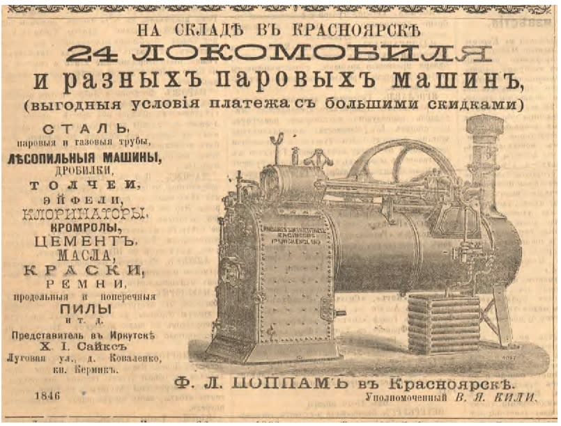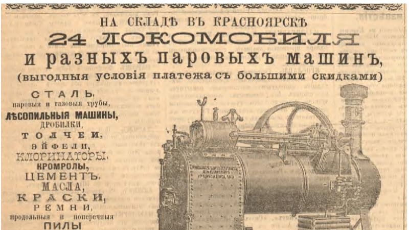Иркутск начала 20 века, как и весь мир, находился под обаянием техники. «Всемирный цементъ! – кричали местные газеты рубежа веков. – Для склеивания фарфора, стекла, дерева… За стклянку 25 коп.». «Последняя новость! Туалетныя часы с зеркалом и музыкой! Вы доставите многое удовольствие себе, семейству и гостям, приобретая самоиграющие туалетные часы с хорошей музыкой «Симфония», играющие очень громко и долго разныя красивые пьесы… как то: «Преображенский марш», вальс «Ожидание», «Невозвратное время», «За Дунай», «Боже, царя храни». Состоятельные иркутяне ставили на двери «электрические секреты, уберегающие от воров». «Лучшая в мире пишущая машинка «Монархъ» обладает следующими важными преимуществами: видимым шрифтом с необыкновенной прочностью и простотой конструкции!», «Технический и электротехнический складъ И.Н. Плотникова извещает о полученных паровых турбинах, паровых турбо-динамо-машинах, паровых турбо-центробежных насосах акционерного общества паровых турбин Де Лаваля в Стокгольме… Находятся в действии и могут быть осматриваемы при желании», – писала газета «Восточное обозрение» в 1899 году. Газеты были заполнены изображениями чудесных паровых машин. У публики популярны были волшебные фонари с движущимися картинками. В Общественном собрании Иркутска впервые в 1902 году дал представления «движущийся парижский фотосинемакалейдотеатр» с электрическим освещением, с 80 «поражающими сюжетами» – от пароходиков на Сене до «неподражаемых превращений, исполняемых первоклассными артистами и артистками парижских театров». А наиболее статусным людям в те годы было принято преподносить маленькие модели больших паровозов, парогенераторов, локомобилей и дирижаблей. Возможно, когда строилась железная дорога в Сибири, в Иркутск и попадали такие сувениры. К примеру, часы-паровоз были бы отличным подарком какому-то статусному чиновнику или служащему дороги.