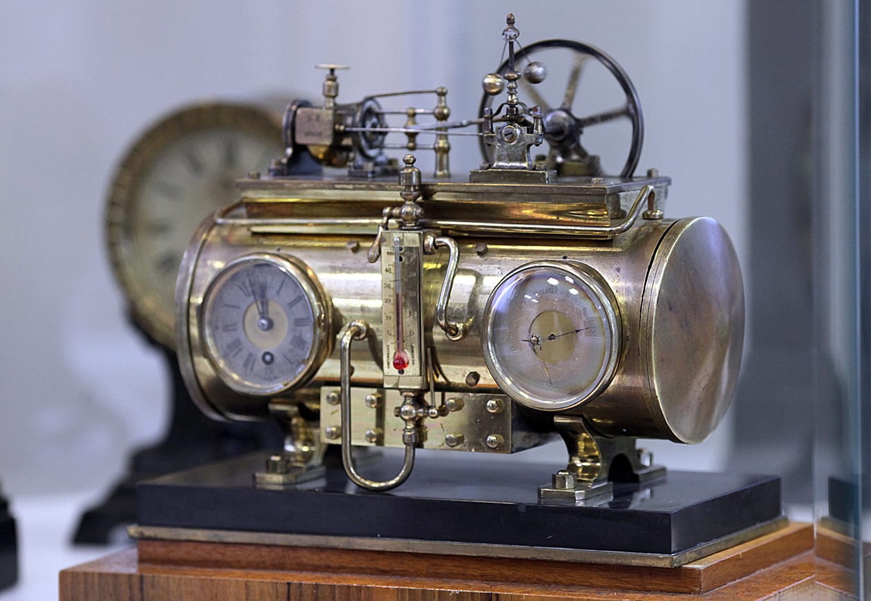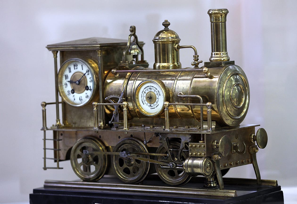 Эти восхитительные вещи были сделаны на рубеже 19 и 20 веков. Часы-паровоз, часы – паровой двигатель, часы-скелетоны. Их можно завести, и закрутятся колёса, начнут двигаться всевозможные устройства, шестерёнки… Интереснейшая коллекция подобных часов демонстрировалась недавно в Государственном историческом музее в Москве. Но и у нас тоже есть на что посмотреть. В Ангарском музее часов хранится несколько экземпляров той эпохи, зари индустриального дизайна. Техника далеко ушла вперёд с тех пор, когда были изобретены паровой двигатель, дирижабль, паровоз. Однако первые дирижабли и паровозы были не просто шедеврами инженерной мысли, они представляли собой своеобразные произведения искусства, поскольку тираж, массовость и серость ещё не стали законодателями мод. Странный мир стимпанка, занимающий умы современных режиссёров, художников и сценаристов, вышел из таких моделей.