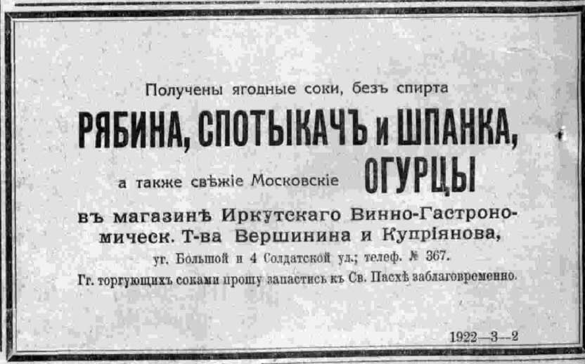 «Вопреки обязательному постановлению городской думы 1914 года о запрете продажи в Иркутске спиртного в ресторане «Модерн» предлагают его каждому желающему, – писал агент на другое утро, поглядывая на полученный вчера счёт и думая, что такие проверки обременительны для казны, а значит, не могут быть частыми. А надо бы почаще, иначе скоро будут и в открытую распивать коньяки и пиво.