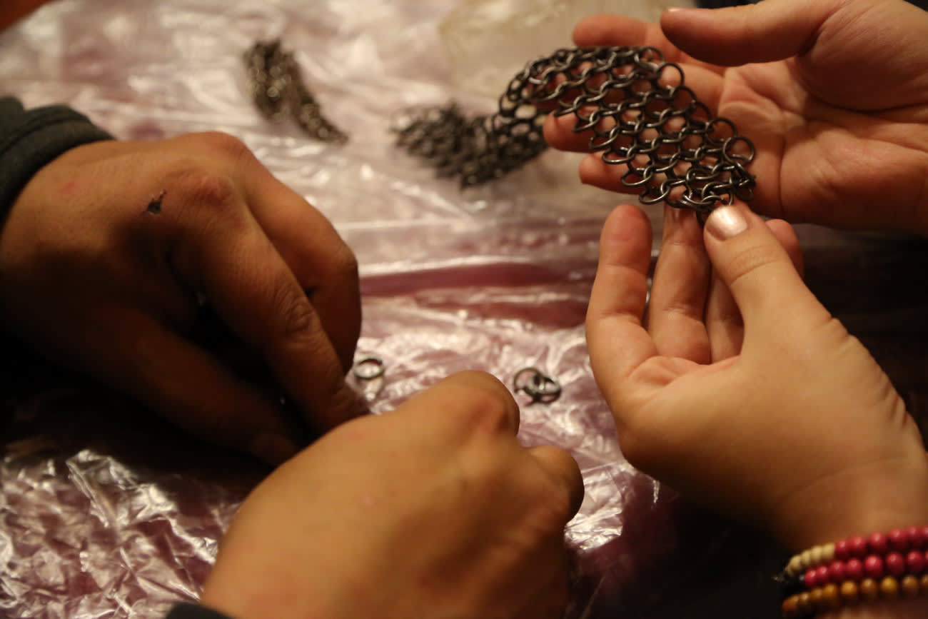 Попав на подобный мастер-класс, нельзя отказать себе в удовольствии побывать в «шкуре» ремесленника из далёкого прошлого. Есть как минимум три вида плетения: четыре кольца в одном, шесть в одном и восемь в одном. Кстати, как говорят сами мастера, если работать именно первым способом и мелкими кольцами, то можно получить вполне неплохой бронежилет, пусть и выглядящий несколько не по столетию. Только вот с размером может быть туговато, так как их бывает всего два: большой и маленький. Но если захотеть, можно самому сплести кольчугу по фигуре. А для того, чтобы почистить её, достаточно обычной колы, рассказывают ведущие необычного урока.