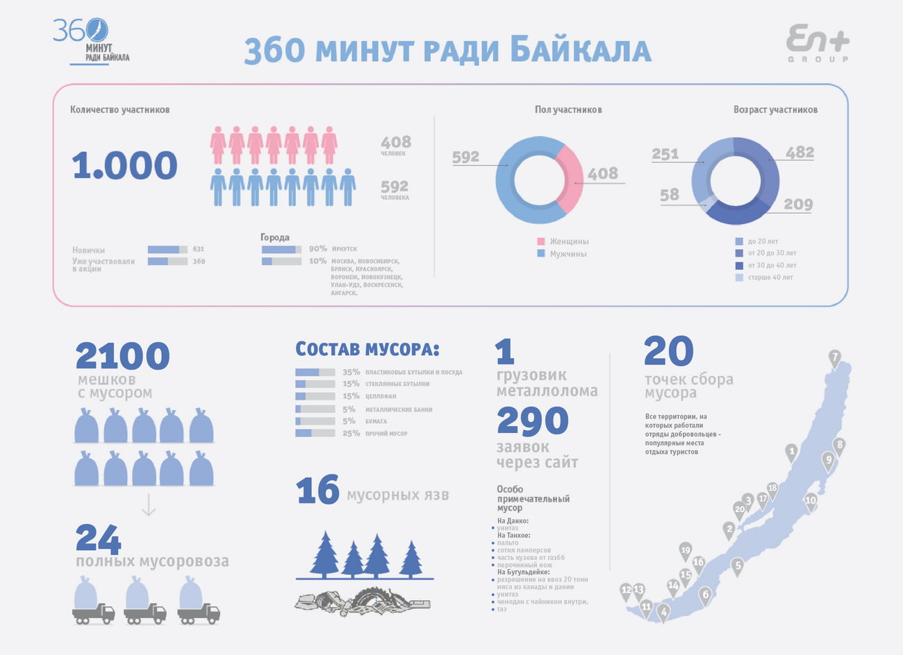 Акция «360 минут ради Байкала» не всегда была такой масштабной. В 2011 году в ней участвовали только сотрудники компаний, входящих в En+ Group. Тогда 100 человек очистили мыс Улирба, собрав почти 500 мешков с мусором. В 2012 году количество добровольцев увеличилось до 420 человек, а число точек уборки – до четырёх. Вместе с сотрудниками En+ чистоту на берегах Байкала наводили партнёры группы из негосударственных организаций «Защитим Байкал вместе», «Байкальская тропа», «Возрождение земли сибирской». Помогали им студенты ИРГТУ, ИГУ и Иркутского энергоколледжа, а также работники Байкальского и Прибайкальского заповедников. К 2013 году количество активистов выросло в 10 раз. Организаторы отмечают, что на сайте акции в этом году было феноменальное количество откликов. В последние дни регистрацию пришлось остановить, потому что всех желающих невозможно было увезти на уборку. Оставить заявку через Интернет успели 296 человек.