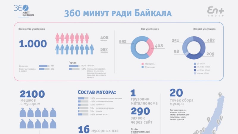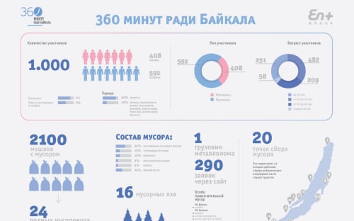 Экологическая акция «360 минут ради Байкала» приобрела всероссийский масштаб. В этом году 1000 добровольцев из Иркутской области, Москвы, Новосибирска, Брянска, Красноярска, Воронежа и других городов решили посвятить шесть часов уборке мусора на Байкале. Благодаря волонтёрам за 360 минут великое озеро стало чище на 2100 пакетов с мусором.