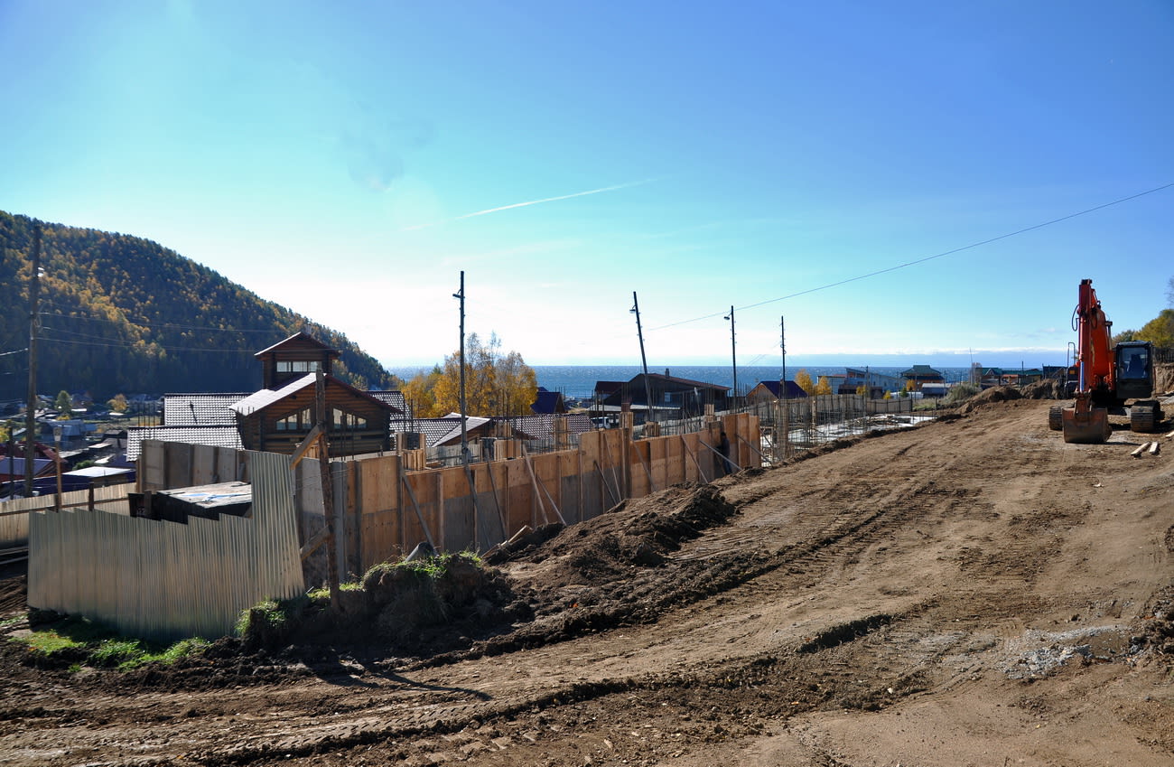 Если преодолеть крутой подъём и прошагать чуть менее четырёх сотен метров до огороженного блестящим металлическим забором участка, который «Байкал Девелопмент» приобрёл под застройку, можно убедиться, что работы на нём уже начались. Пока возведены колонны и ригели цоколя, потихоньку надстраивают перекрытия первого этажа. В сторонке от стройплощадки, по которой неторопливо передвигаются несколько рабочих, сиротливо стоит ярко-оранжевый экскаватор Hitachi, использовавшийся, очевидно, для того, чтобы выкопать котлован для будущего дома.