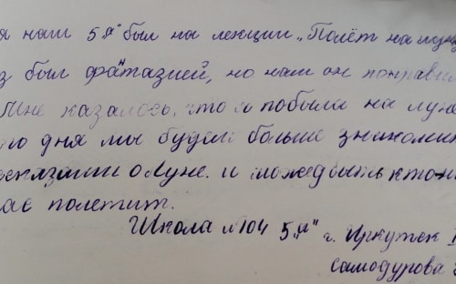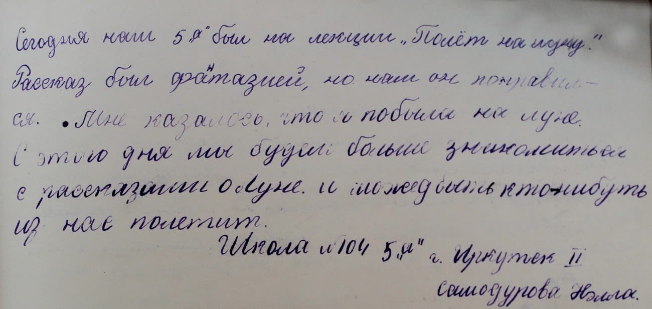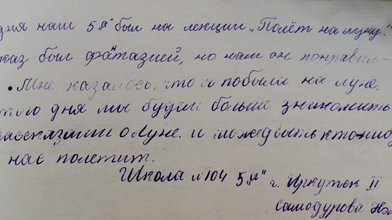 «Сегодня наш 5 «А» был на лекции «Полёт на Луну». Рассказ был фантазией, но нам он понравился. Мне показалось, что я побывала на Луне. С этого дня мы будем больше знакомиться с рассказами о Луне, и, может быть, кто-нибудь из нас полетит», – этим строчкам более полувека. Написала их когда-то школьница из Иркутска II Нэлла Самодурова. Что с ней стало, как прожила она свою жизнь, мы уже не узнаем. Но осталась эта запись, сделанная 24 февраля 1957 года в книге отзывов Иркутского планетария. Фиолетовые чернила, неровный, но старательный почерк ребёнка. В нём – мечта целого поколения о космосе. И вера – когда они вырастут, люди уже точно будут жить на Луне. Оставалось несколько месяцев до того, как СССР откроет космическую эру – запустит на околоземную орбиту первый искусственный спутник Земли.