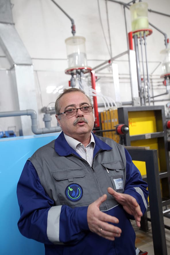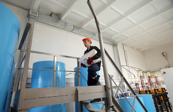 При въезде на закрытую территорию одной из таких станций – режимного объекта, расположенного в районе Ершей, первое, что приковывает взгляд, – асфальт, по которому идёшь. На его поверхности лежат небольшие пригоршни самой обычной поваренной соли. Она просыпалась из десятка мешков, сложенных в большом деревянном ящике чуть поодаль. Такие запасы появились здесь не просто так – именно соль является главным исходным компонентом, необходимым для работы новой очистной установки. Она заменила собой хлор, который использовали прежде, и это главное отличие от того, что было раньше. «Система обеззараживания осталась практически прежней, как была основана на хлорировании, так и осталась такой, – говорит директор МУП «Водоканал» Иркутска Сергей Винарский, – просто до этого хлор брали как готовый продукт: его здесь складировали в большом объёме, и потом он направлялся напрямую в сеть. Сегодня же мы вырабатываем его на месте и сразу используем. Вырабатываем именно в тех объёмах, которые нужны: не тоннами, а по несколько килограммов».