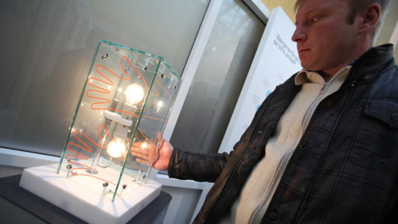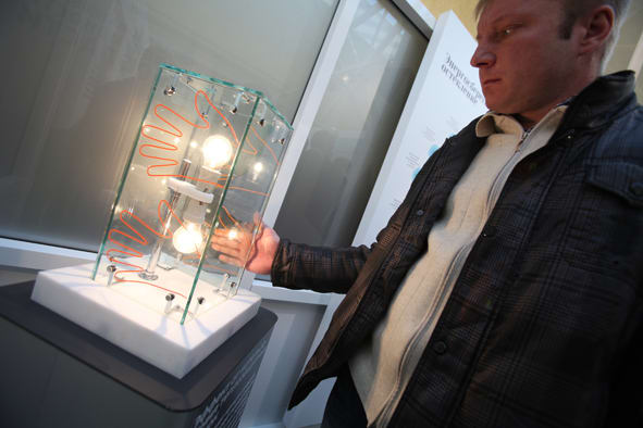 Один из партнёров НИ ИрГТУ, в частности, демонстрирует, какие трубы можно использовать при прокладке сетей тепло- и водоснабжения, чтобы сократить до минимума потери энергоресурсов. Здесь и труба с пенополиуретановой изоляцией, которую применяют достаточно широко, и короткий отрезок трубопровода с греющим кабелем – в наших краях подобное пока считается экзотикой. Несколько шагов, и мы у наглядного пособия в прямом смысле этого слова: на стенде рядами выстроились светодиодные лампочки и классические лампы накаливания, маркированные по мощности.