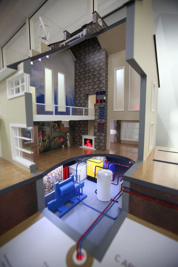 «Здесь продемонстрированы технологии, которые в большей степени можно использовать в быту, – говорит Толстой, открывая дверь зала на втором этаже. И тут же показывает на потолок: – Обращаю внимание: здесь для освещения используются светодиоды». Под их светом выстроились наглядные пособия, представляющие ничуть не меньший интерес, чем то, что выставлено этажом выше. Сразу в глаза бросается макет небольшого дома с вертикальными ветрогенераторами на крыше. Если обойти его с другой стороны, можно увидеть модели солнечных панелей и теплового насоса – того оборудования, которое позволяет существовать автономно от централизованных электрических и тепловых сетей.