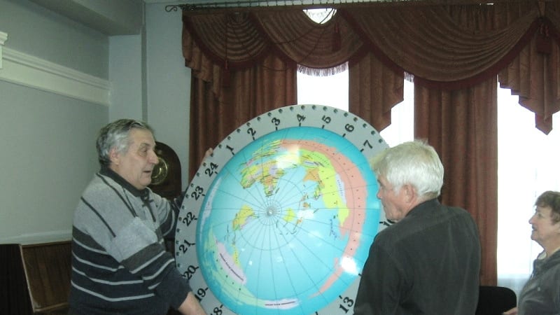 На Земле, конечно, существуют часы, решающие проблему «как узнать время в любой точке мира». Но решение российских конструкторов весьма оригинально. К примеру, есть в мире часы «Гео­хрон», которые представляют собой прямоугольный экран с кольцевой картой мира, нанесённой на ленту, которая медленно вращается синхронно движению Земли. Часы позволяют определить солнечное, всемирное и местное время по Гринвичу, освещённость Земли Солнцем. Однако точное определение времени по ним требует использования расчётных таб­лиц и удобны они скорее специалистам. Часы «Глобальное время» рассчитаны на обычного человека. Простые правила позволяют легко узнать время на любом континенте.