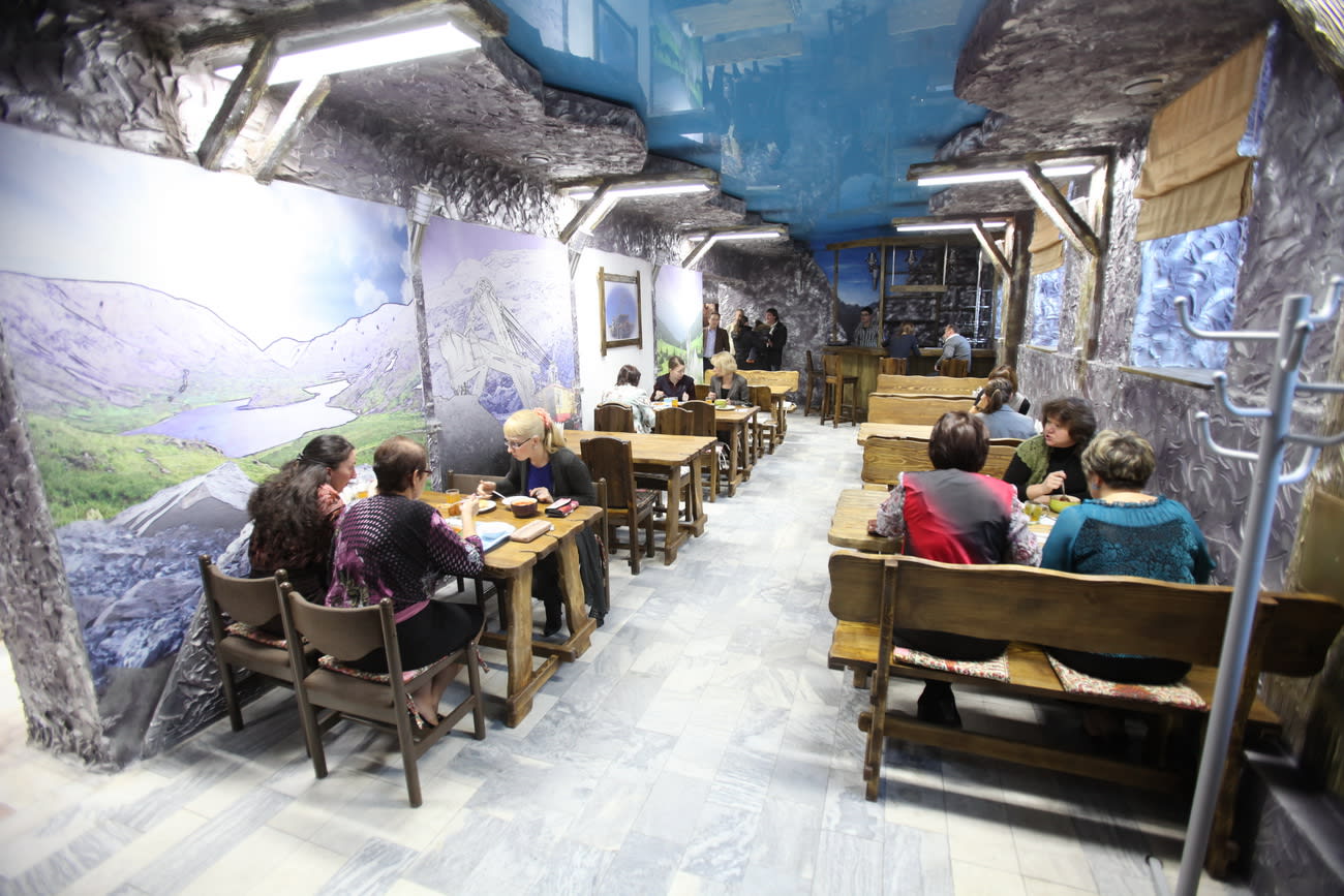 И действительно, дизайнеры интерьера попытались сохранить эффект присутствия посетителей не просто в ресторане, а в штольне, из разреза которой можно видеть знакомые многим пейзажи – зелёные степи, берёзовые рощи. В вечернее время эффект усиливается при помощи специальной подсветки, рассказали представители дирекции заведения.
