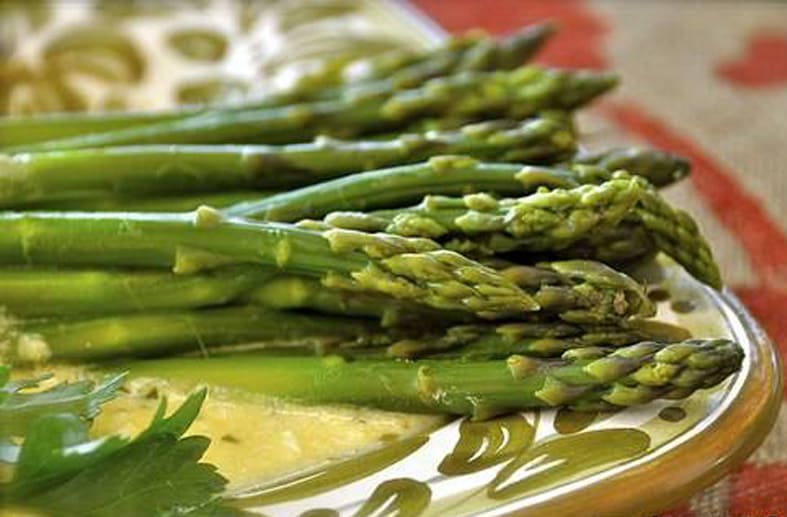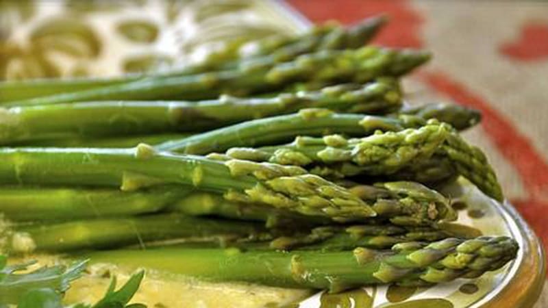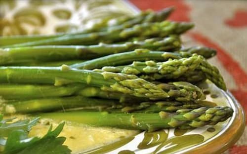 Для первого блюда молодые стебли спаржи нарезать кусочками по 2 см, сварить в подсоленной воде, добавить немного сахара, порубить зелень (перо лука, петрушки и т.д.), залить взбитыми яйцами и запечь.