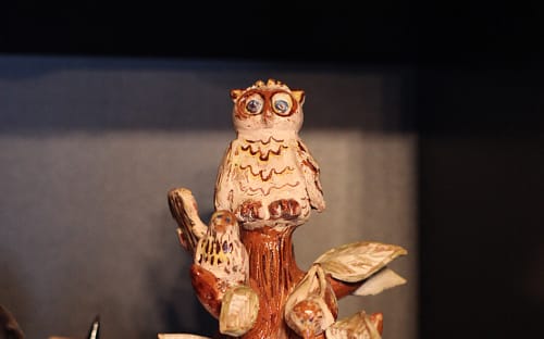 Другие бросающиеся в глаза вещицы и вещи – миниатюрный бюст Петра Первого, привезённый в подарок из Санкт-Петербурга. Кончик носа у него отколот – это он упал носом на сибирскую землю. Что-то вроде родословного деревца, только вместо портретов и имён птицы. Кто-то именно так увидел Театр пилигримов и вылепил дерево, увенчав его совой, птицей ночной и тревожной. Маленькая ёлочка – Новый год же скоро!