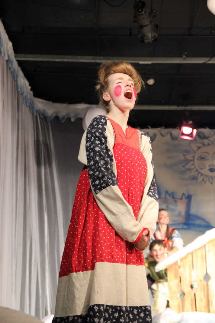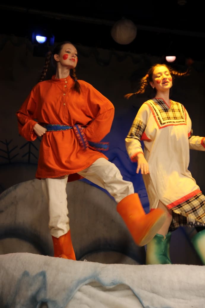 Щука, исполняющая желания, сугроб, в котором расцветают алые розы, а также говорящие сани, которые едут сами, – это далеко не все чудеса сказки. Всё, что происходит на сцене, комментируют озорные и задиристые скоморохи. Они поют, танцуют и не забывают подшутить над наивным царем. Государь же вовсю пользуется своими властными полномочиями и отрубает головы подданым направо и налево.