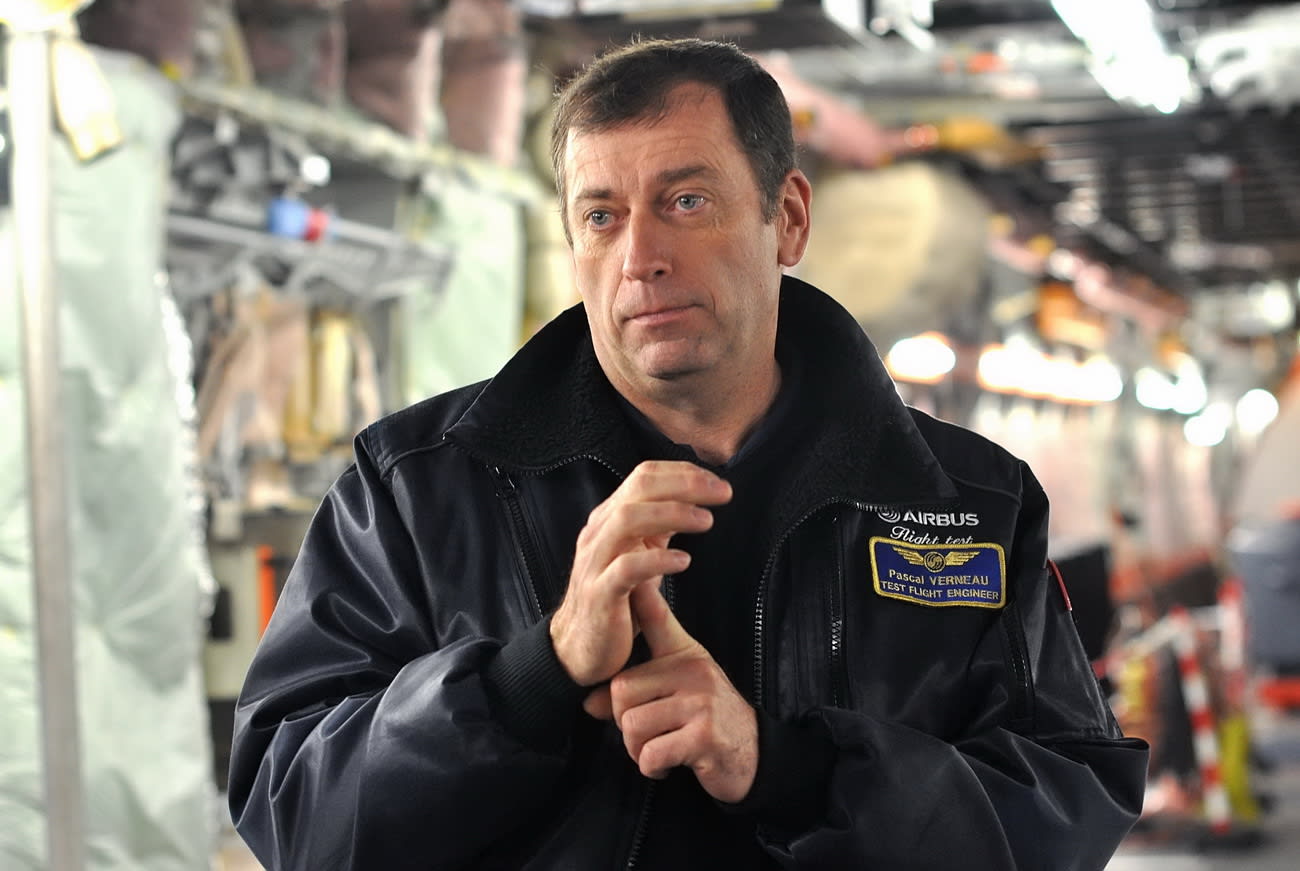 Этот рассказ мы выслушиваем, стоя возле громадного самолёта, который месье Верно ласково называет своим большим ребёнком. Наш собеседник показывает на латинские буквы, нарисованные на створках ниши передней стойки шасси. «Вэ – Эн – О», – читает он бортовой номер. И тут же демонстрирует нашивку на лётной куртке: «Это моя фамилия: Верно». Действительно, таким способом коллеги поздравили своего коллегу, назвав второй тестовый и четвёртый по счёту собранный «Три-восемьдесят» в его честь. И есть за что: главному-инженеру испытателю Airbus принадлежит мировой рекорд, ведь в А380 он провёл 3800 лётных часов. А когда его спрашивают, какие ещё самолёты он испытывал, начинает загибать пальцы: «А320, 321, 330, 340, 340-600… Практически на всех, кроме А300 и 310». Начинал он ещё механиком, обслуживающим бомбардировщики Dassault Mirage IV. Потом работал пилотом вертолёта в службе спасения, пока в 1993 не прошёл обучение на инженера-испытателя. В общей сложности Паскаль Верно летал более чем на 90 типах самолётов и вертолётов и сохранил квалификацию пилота, но сам признаёт: «Работать инженером-испытателем интереснее, ведь ты вникаешь в работу всех систем самолёта, тогда как лётчик только им управляет». На этом ланч с ним заканчивается: испытателя ждёт «маленький ребёнок» – один из двух Airbus A350XWB, которые проходят лётные испытания.