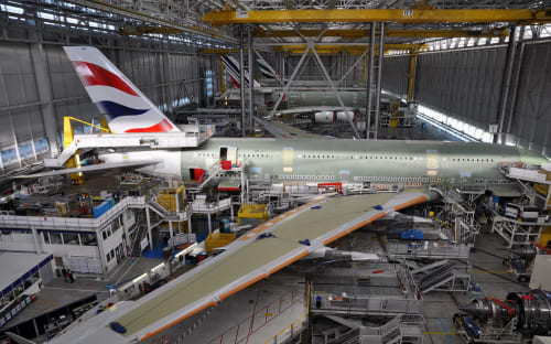 Окраску и установку салона на Airbus A380 производят на заводе в Гамбурге, но по пристыкованному к самолёту хвосту уже в Бланьяке можно понять, флот какой авиакомпании пополнит новый лайнер