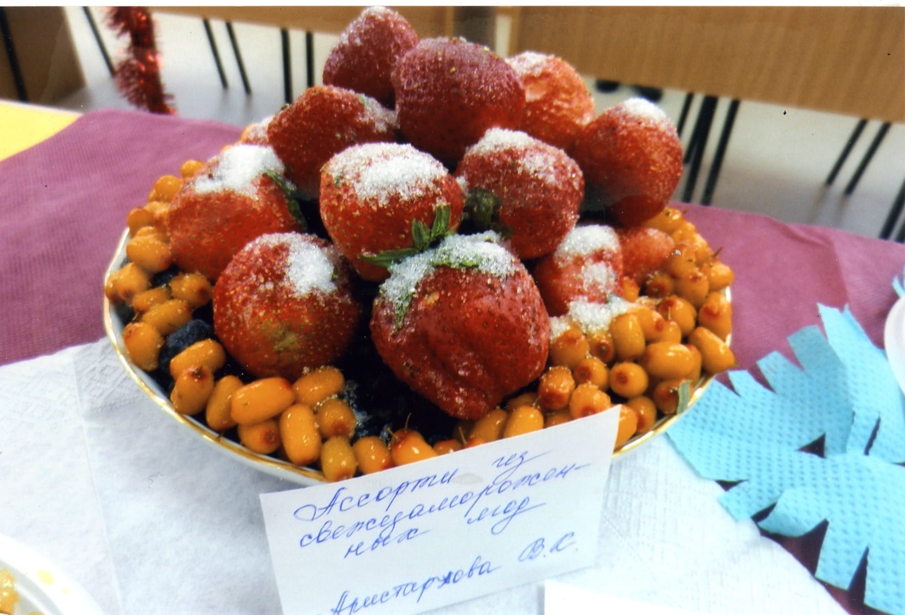 Необычайно красивы были и ассорти из свежих ягод, представленные В. Аристарховой и Т. Одинцовой. Их запах ещё раз напомнил нам о лете.