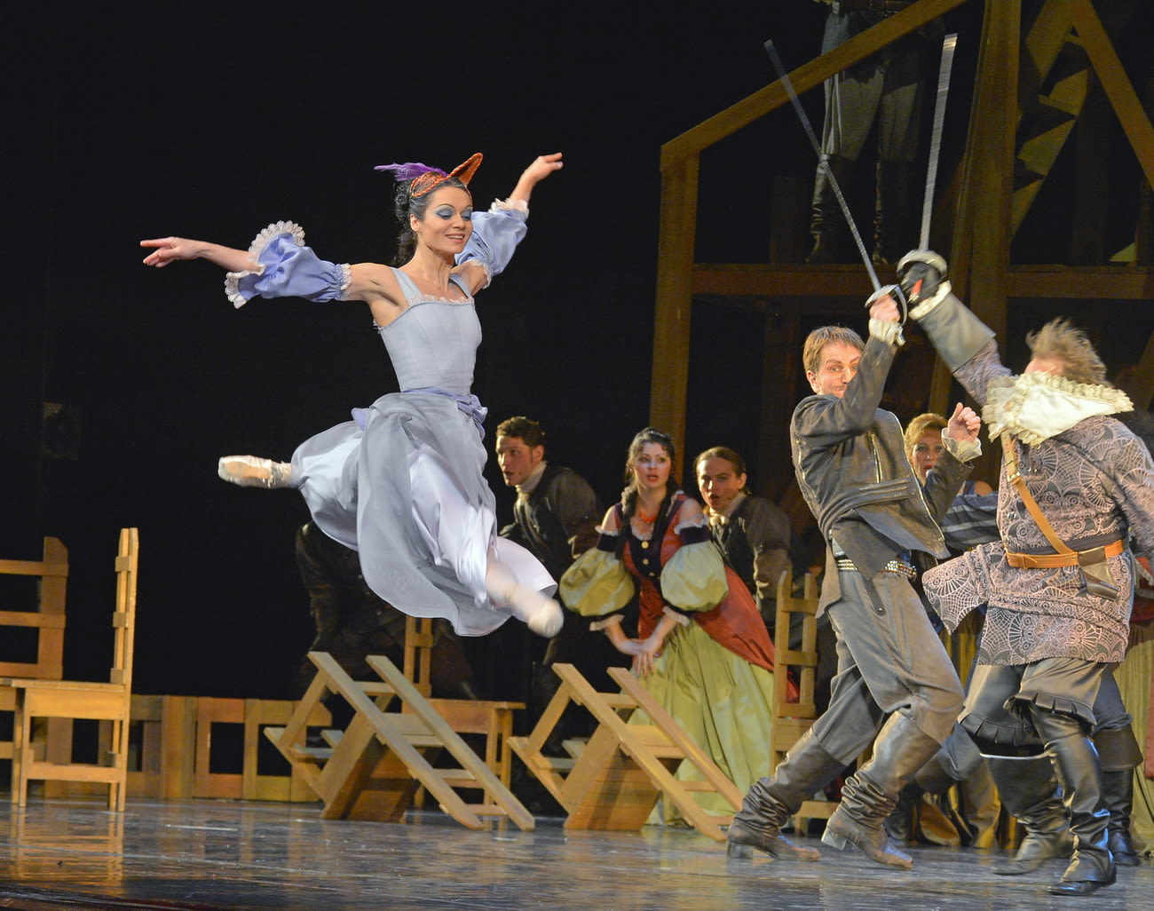Спектакль с первых тактов вовлекает нас в атмосферу венецианского карнавала. Звучит страстная и загадочная музыка, и в языках пламени танцует прелестная девушка – Муза поэта (солистки балета Мария Стрельченко и Дина Ясницкая). На протяжении всего спектакля Муза будет сопровождать Сирано. На сцене грубая деревянная фактура – лестница, она и зрительный зал, и балкон Роксаны. Смотрится весьма театрально (сценография и костюмы петербургской художницы Ирины Долговой).