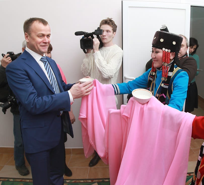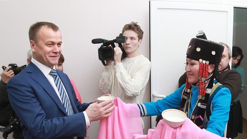 Поэтому дорогих гостей у входа в школу встречали сразу две партии красавиц в национальных костюмах. Четыре девушки в белорусском одеянии держали в руках блюдо, полное вкусных вареников с картошкой. Как выяснилось позже, девушки представляли местный коллектив, который так и называется – «Варэнички». Чуть позже к «Варэничкам» присоединились две бурятские национальные красавицы с белой пищей на подносе.