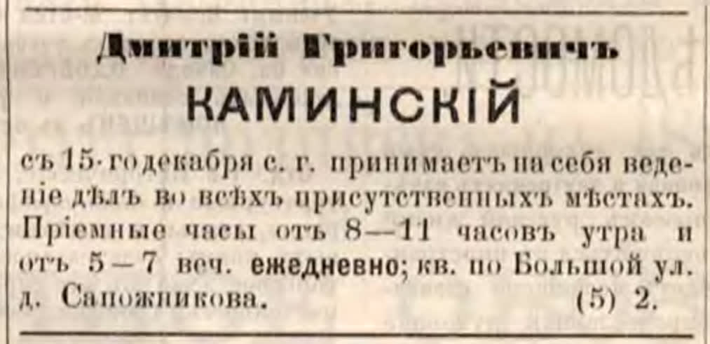 Однако размышлениям провинциального адвоката отдали семь номеров! И Каминский очень неспешно и очень обстоятельно проанализировал работу сибирских судов, подробно описал её многочисленные изъяны и всю степень зависимости от местной администрации. Отдельную главу посвятил он крайне незавидному положению местной адвокатуры, состоящей из малообразованных и морально нечистоплотных господ.