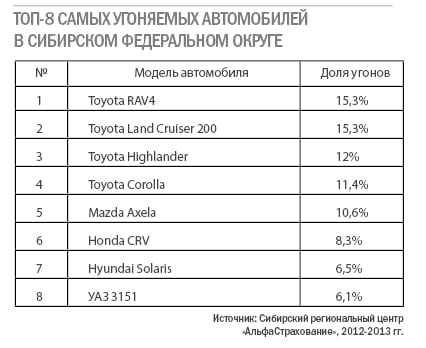 Рейтинг самых угоняемых машин Сибирского федерального округа в 2013 году возглавили модели японского автопрома. Самыми «популярными» среди угонщиков Сибири стали автомобили Toyota RAV4 и Toyota Land Cruiser 200 (30,6% от общего числа угонов). В 2012 году рейтинг также возглавляла марка Toyota, но другая модель – Camry (28,6%), сообщили в «АльфаСтраховании».