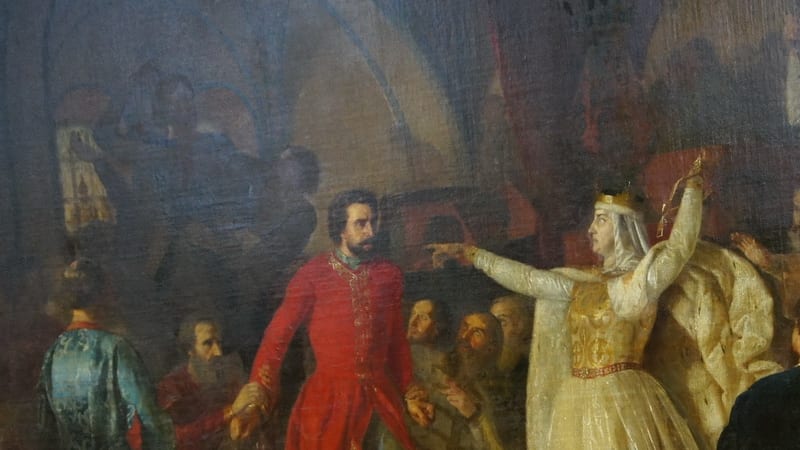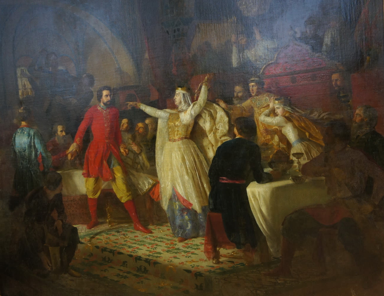 Наконец, вас ждёт сюрприз – большая историческая композиция «протестанта» Николая Дмитриева (Оренбургского), исполненная им ещё в академии. Одно из лучших произведений нашей коллекции более 15 лет находилось на реставрации. У него длинное название: «На свадьбе великого князя Василия Тёмного в 1433 году его мать Софья Витовтовна (невестка Дмитрия Донского) отнимает у князя Василия Косого пояс с драгоценными каменьями, принадлежавший некогда Дмитрию Донскому». Это одна из первых новых исторических картин, исполненных на отечественный сюжет, взятый из «Истории государства Российского» Н. Карамзина. Любопытный факт: картина появилась в Иркутске ещё во второй половине XIX века и была хорошо известна горожанам, так как в 1881 году экспонировалась на выставке в Иркутской мужской гимназии. В связи с этим жителям была предложена лекция «Древнейшие великокняжеские и царские браки (культурно-исторический этюд по поводу выставленной картины «Ссора на свадьбе Василия Тёмного)». Её читал талантливый сибирский историк Иван Васильевич Щеглов.