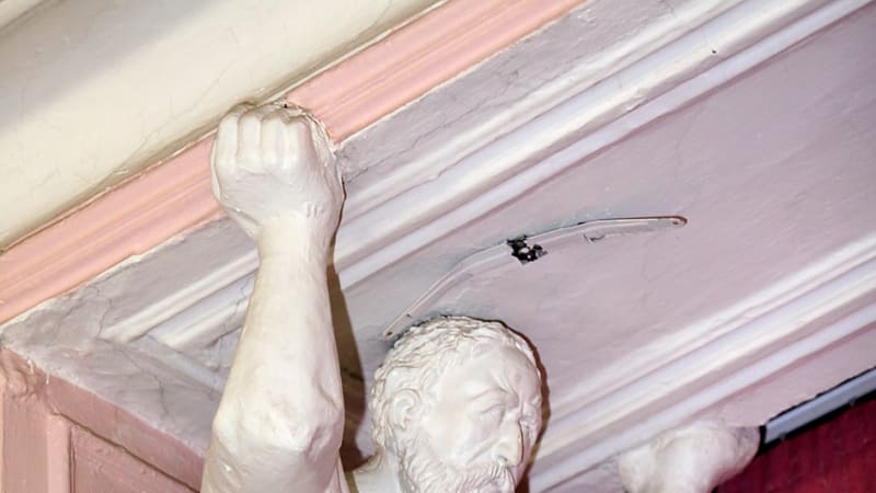 После обрушения потолка люстру спустили от греха подальше и закрыли зал