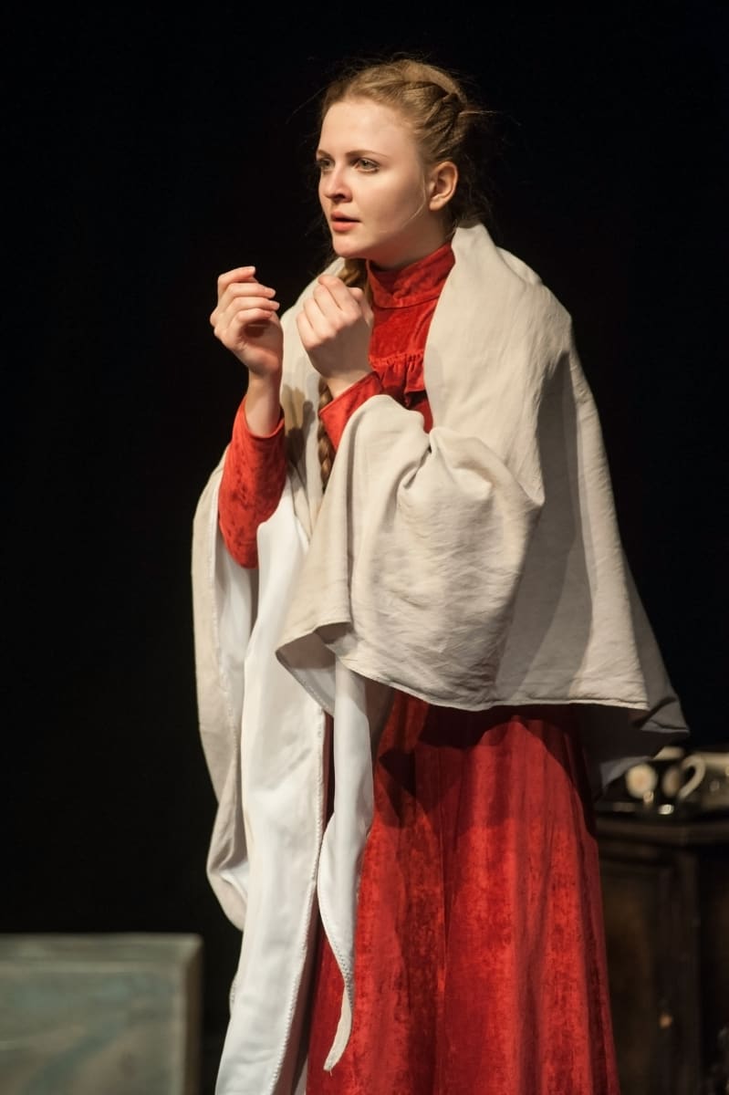 В образе Катерины странным образом соединяются абсолютное свободолюбие и не менее абсолютная набожность. Два взаимоисключающих качества, которые не только терзают героиню, но и в итоге уничтожают её душу. Студентка (наверное, уже можно говорить «актриса») Екатерина Константинова точно создаёт на сцене эту двойственность характера: страх Божьего наказания и бунтарство против «тёмного царства», которое приводит её к пропасти.