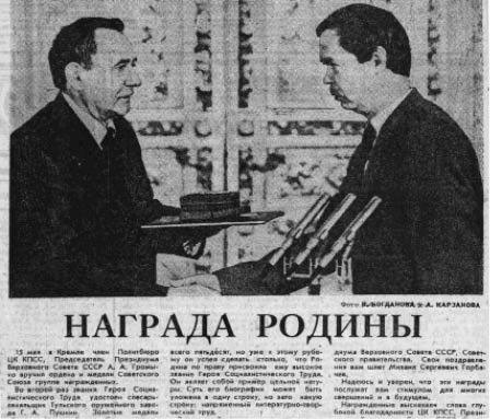 А теперь перекинемся без малого на три десятилетия вперёд. 23 мая 1987 года «Восточно-Сибирская правда» также на первой странице поместила фотографию и подробное сообщение ТАСС под заголовком «Награда Родины». Оно о том, что член Политбюро ЦК КПСС, председатель Президиума Верховного Совета СССР А.А. Громыко вручил в Кремле ордена и медали группе награждённых, в том числе золотую медаль «Серп и молот» Героя Социалистического Труда и орден Ленина писателю В.Г. Распутину. И эта публикация, как выясняется, тоже не вошла в биобиблиографические указатели его творчества. Поэтому приведу тексты выступлений участников награждения.