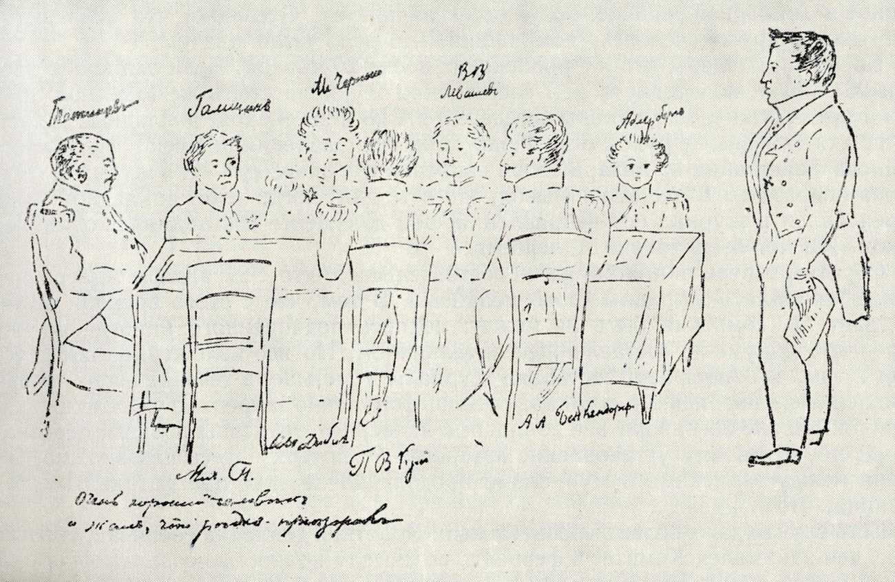 Допрос декабриста следственным комитетом 1826. Рисунок Владимира Адлерберга
