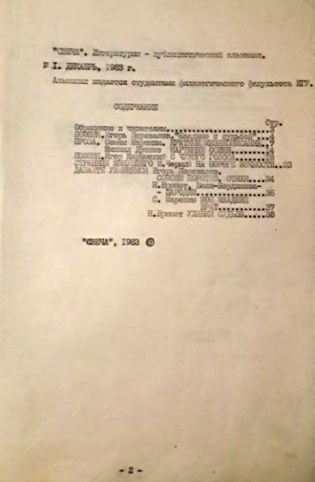 В числе тех, кто работал над альманахом, были Михаил Дронов, Елена Веселкова, Владимир Симиненко, Сергей Нечаев, Игорь Перевалов, Павел Мигалёв, Игорь Черток. Печатали всё на машинке. В конце первого номера можно прочитать: «Уважаемые авторы и читатели! Технический отдел редакции приносит вам свои извинения за низкий уровень печатания. Желающие ликвидировать этот недостаток и обладающие квалификацией машинистки могут обратиться в редакцию. Мы будем рады вашей помощи!». Журнал просуществовал до 1984 года, пока его не решили прикрыть. Пятикурсник Подшивалов нажил себе большие неприятности. Его начали таскать в деканат, на допросы, поскольку в журнале было достаточно крамолы по советским временам. «Мы пойдём другим путём», – сказал паровоз и застрял в болоте» – эту фразу можно было прочитать в милом и «невинном» альманахе. В нём «было полно сумасшедших стихов», пессимистических рассказов, статей об анархизме. Все это закончилось «волчьим билетом» для Подшивалова (диплом он всё же позже, но защитил). «Слава Богу, хоть не посадили», – заметил Владимир Скращук. «Издание «Свечи» возобновилось от имени «Социалистического клуба». Три номера в 1988-м и один в 1989 году объёмом от 70 до 97 страниц формата А4. Все выпуски были одинаково оформлены: машинопись, проволочные скрепки, обложка из картонной папки для бумаг. Для №№ 2–4 сделали фотообложку и рисованные заставки для каждой рубрики», – сообщил Владимир Скращук.