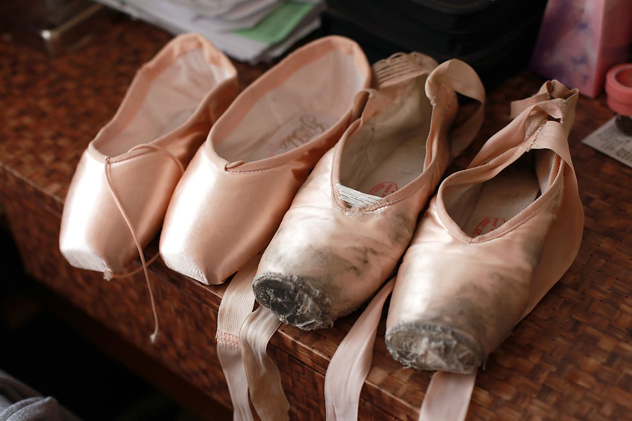 – Вот в этой паре я сейчас работаю, не ужасайтесь, пожалуйста. Когда мы балет «Милый друг» ставили, я за постановку пар шесть-семь пуантов сносила. Они ломались на мне во время репетиций, такая была нагрузка. Особенно быстро стелька разнашивается на прыжке. Перед выходом пуанты надо обязательно размять, в новых никто никогда не пойдёт на сцену, это практически испанский сапог. Пуанты – испытание для ног, частенько пальцы стираются в кровь, поэтому я, например, заранее проклеиваю их лейкопластырем. Мочить и стирать пуанты нельзя, поэтому мы просто пудрой замазываем какие-то потёртости или пятна. Иногда и штопать пуанты приходится, и не только нам. Порой смотришь запись премьеры в Большом театре, стопы балерин показывают крупным планом, приглядываешься: и у них пуанты проштопаны, словно кружевные.