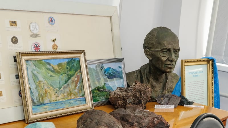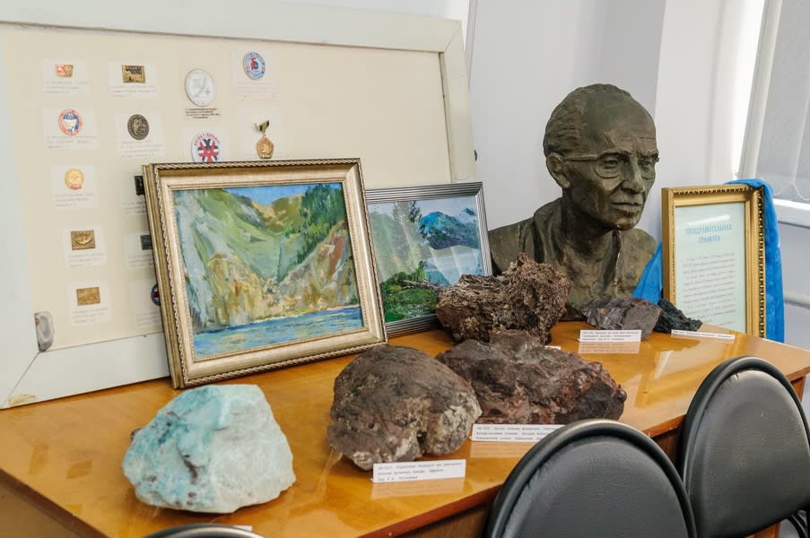 Первым делом мы проходим в маленький кабинет большого учёного Геннадия Уфимцева. По словам коллег, это был непререкаемый авторитет в области геоморфологии, неотектоники и геологии кайнозоя. Уфимцев – автор 700 научных работ, включая 9 монографий, он был награждён золотой медалью имени Пржевальского Русского географического общества, это высокая для любого учёного награда. Кабинет Уфимцева – классический пример того, что талантливый человек талантлив во всём. Дело в том, что всё здесь сделано руками учёного.