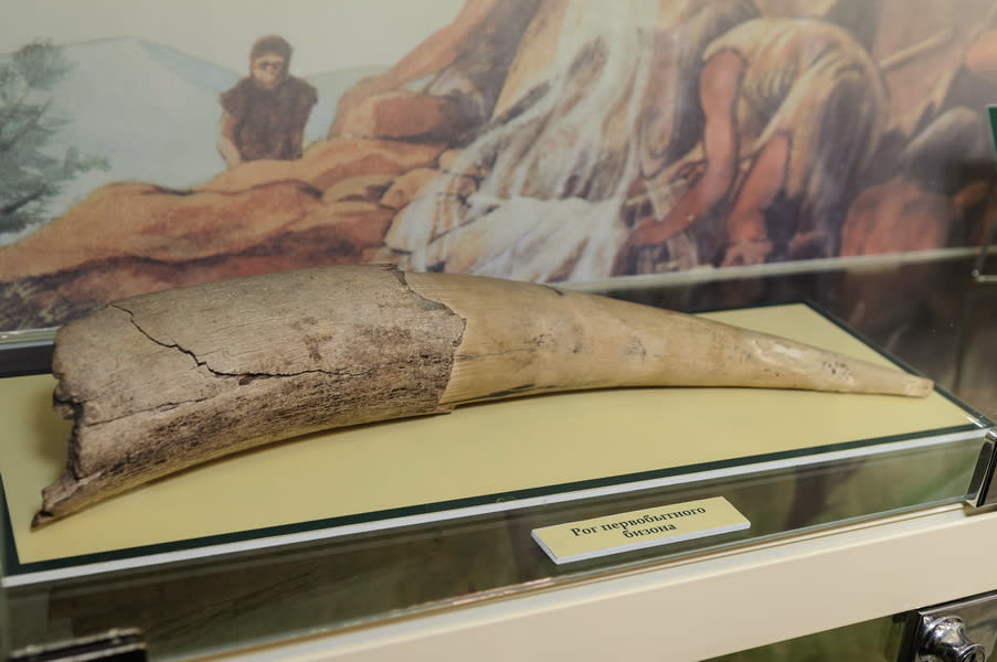 А второй зал отдан уже истории школы, – рассказывает педагог и директор музея Лилия Харченко. – Глазково находится на горе, и сам собой возникает вопрос: «Что из себя представляет эта гора?». Мы даём ответ на этот вопрос: мы сделали срез горы и поместили его в витрину. И на срезе любой увидит, насколько это древнее место – наш Глазковский некрополь, сколько минералов и горных пород залегает довольно близко к поверхности земли. В Спортивном переулке, где ещё есть частный сектор, люди углубляют свои погреба и натыкаются на единичные захоронения первобытных людей. Такие удивительные вещи до сих пор происходят. Когда наши дети изучают естествознание, первобытную историю и историю Древнего мира, мы их приводим в музей и какие-то предметы можем продемонстрировать уже наглядно. Например, рог первобытного бизона, кости благородного оленя, трубчатую кость мамонта – всё это подарки нашему музею.