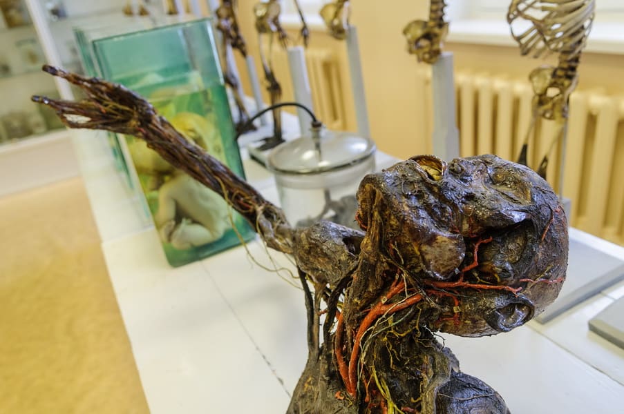 Один из старейших экспонатов музея – завещанное тело. Прозектор Валерий Бекренев ещё в 1925 году, вскрывая трупы, заразился. Он решил завещать своё тело науке, медуниверситету. Таким образом он себя в какой-то степени увековечил.