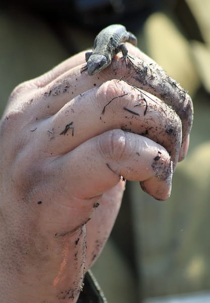 Местные, перемазанные в саже, таскают вёдра и заливают тлеющие пни. Один из пожарных вытаскивает из пепелища обессилевшую от дыма ящерицу.