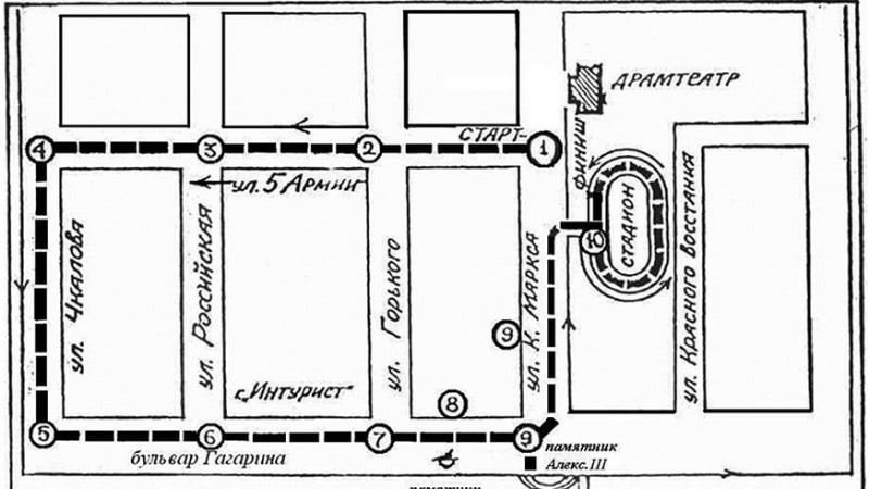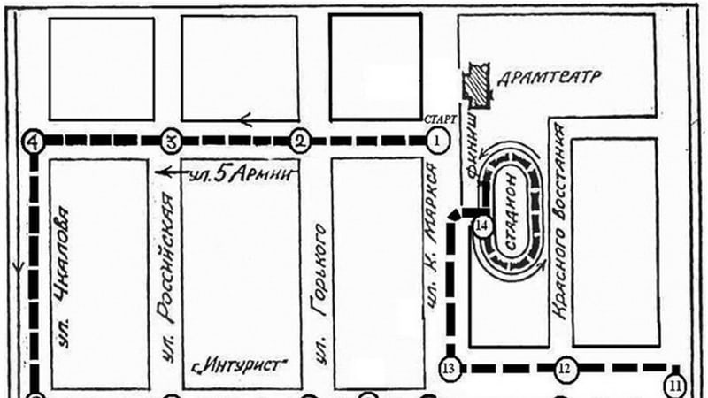 1 этап – старт с ул. К. Маркса по ул. 5-й Армии до ул. Горького (600 м);