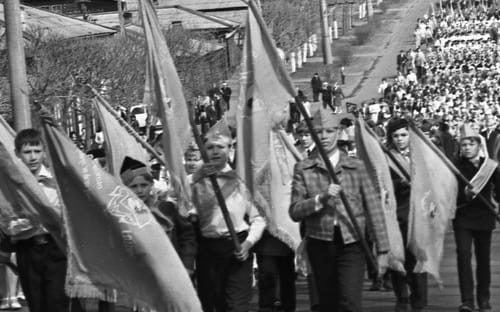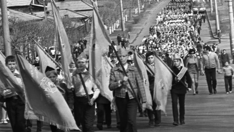 А в физкабинете на окне установили усилитель, передают торжественные марши. Кто-то от здания горсовета пускает красные ракеты.