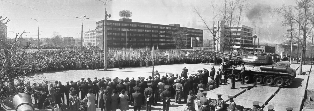 На главной площади города состоялся стихийный митинг. Народ был одет празднично, люди стояли с цветами, красными знамёнами, портретами Сталина. Многие плакали от радости. Секретарь горкома партии Б. Кобелев открыл митинг и поздравил трудящихся с Великой Победой. Выступавшие давали клятву Родине, партии и Сталину работать с большей энергией, чтобы советская страна стала ещё более могучей и богатой. До позднего вечера люди не расходились по домам. На Большой улице нескончаемые толпы гуляющих. Едут на велосипедах, автомашинах, грохочут мотоциклы, испуская клубы дыма. Гуляющие по улице Карла Маркса мужчины раскованны и раскрепощены. Большинство с заполненными или уже пустыми кувшинами, графинами, бутылями, всюду чокаются и выпивают. Над городом летают самолёты и сбрасывают праздничные листовки со словами «С Победой, товарищи!». В Крестовоздвиженской церкви было совершено торжественное богослужение. Храм не смог вместить всех желающих, поспешивших в этот день сюда в порыве благодарных чувств. Служба шла при открытых дверях.