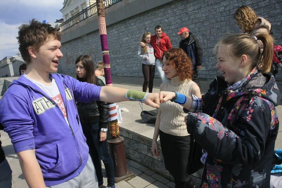 «А зачем это?» – вопрошали наиболее прагматичные граждане, преимущественно мужчины, глядя, как пятеро девушек, вооружённых пряжей и заготовленными вязаными фрагментами, облепили фонарный столб и ограждение в непосредственной близости от Московских ворот. Бесспорно, в солнечный день 1 мая можно было найти массу других, более полезных занятий. Однако мы, улыбаясь и пожимая плечами, продолжали своё тёплое дело: потому что нравится, потому что красиво.