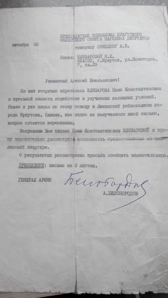 Что же говорить, когда сам Афанасий Павлантьевич Белобородов в 1980 и 1981 годах лично писал три письма в Ленинскую администрацию с просьбой улучшить жилищные условия Нины Константиновны. Уже тогда, будучи известным и уважаемым человеком, депутатом Верховного Совета СССР III и VII созывов, награждённым пятью орденами Ленина, орденом Октябрьской Революции, пятью орденами Красного Знамени, орденами Суворова I и II степени, Кутузова II степени, Отечественной войны I степени, «За службу Родине в ВС СССР» III степени, медалями, иностранными орденами и медалями, он не получил ни одного ответа и уж тем более никакой реакции.