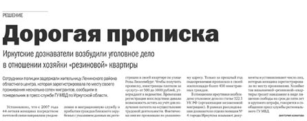 Сделки были мнимыми. По информации, предоставленной региональным Управлением ФМС России в Правобережном округе Иркутска, восемь мужчин и женщин разных возрастов, национальностей, рода занятий, зарегистрированных в одном помещении по улице Дзержинского, фактически в нём не проживают. Когда сотрудники явились с проверкой паспортного режима в заинтересовавшую их «вместительную» квартиру, они увидели деревянный двухэтажный дом с офисными помещениями. Жилых же комнат, а также каких-либо признаков проживания в этом здании людей, тем более в таком количестве, инспектора обнаружить не сумели.