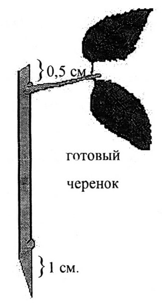 Теперь можно рассказать и о самом черенковании. Сначала нужно обратить внимание на почки в пазухах листьев: они должны быть нормально сформированы, хорошо видны в пазухе листа, с округлой макушечкой. С высокими, конусовидными почками желательно черенки не делать. Для работы нужен острый как бритва нож, секатор для такой работы не годится. Нарезаю черенки, состоящие обычно из двух почек. Под нижней почкой делается косой срез, длинная сторона среза не менее 1 см со стороны почки. Над верхней почкой оставляю пенёк не более 0,5 см, можно прямой или слегка косой, в этом случае длинная сторона среза должна быть над почкой. С нижней почки лист убирается полностью, верхний лист укорачиваю, оставляя только две листовые пластинки. Черенок готов. Перед нарезанием черенков нужно приготовить раствор корневина по инструкции, развести не водой, а очень слабым раствором гумата. Нарезанные черенки ставятся в эту смесь на сутки.