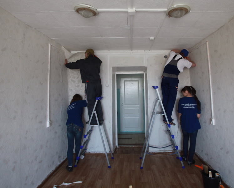 Мы просим молодых рабочих поделиться секретами мастерства. «На то они и секреты. Если расскажешь, это уже не секрет», – не слезая со стремянки, отшучивается от долгих разговоров Василий Шишкин из Черемхова. Зато Степану Селезнёву из Братска беседа не мешает трудиться. «Для меня основное – начать. Если первый лист наклеишь удачно, дальше всё пойдёт отлично, – рассказывает парень. – Отделка – это занятие для меня. Люблю, когда людям нравится, когда они довольны моей работой. Мне часто приходится клеить – обычно работаем в техникуме, в квартирах заказчиков».