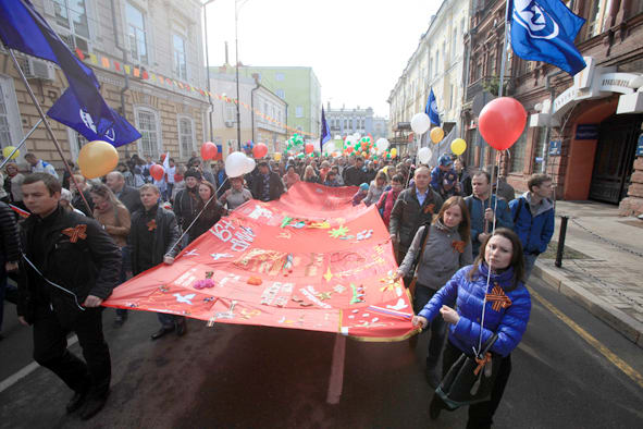 Большое знамя Победы пронесли энергетики по улицам Иркутска 9 Мая. Оно состоит из множества частей, на которых молодые специалисты постарались выразить свою благодарность ветеранам Великой Отечественной войны. Акция была организована ГК «Базовый элемент», в следующем году планируется объединить знамёна нескольких городов в одно.
