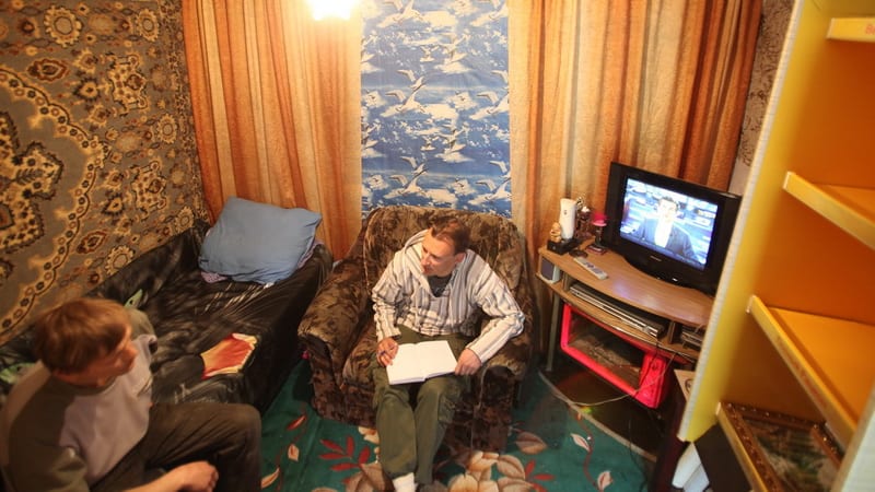 – Разувайтесь! – строго напоминает Александр. Пол застелен ковром, ещё один висит на стене, потолок оклеен узорными пластиковыми квадратами. Справа – незастеленный диван, Александр извиняется – приболел, много лежит. В углу на тумбе стоит цветной телевизор, на экране – новости, под ним – DVD-плейер. Там, где в тумбе обычно стоят колонки и хранятся диски, стоит странная железная коробка без передней дверцы.
