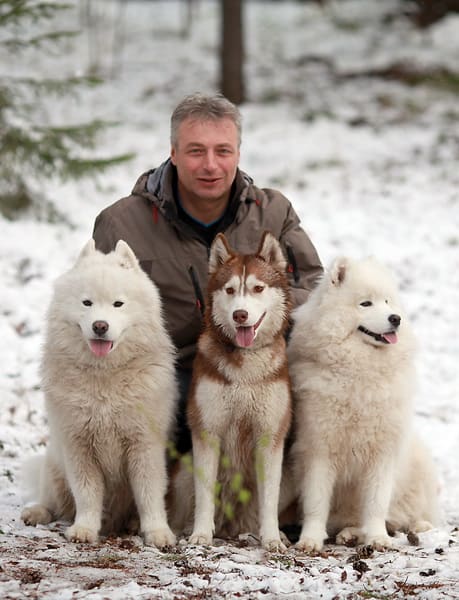 Про самоедов много слышал, но впервые увидел их в цирке Никулина в Красноярске в конце 1990-х: на арену выбежала толпа этих собак, и меня, что называется, захлестнуло напрочь. Но Интернет был ещё мало развит, мы не знали, где их можно взять, а у нас их вообще не было. Самому первому самоеду в Иркутске сейчас 12 лет, его все знают и зовут Дедушка Шерлок.