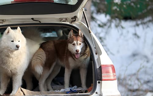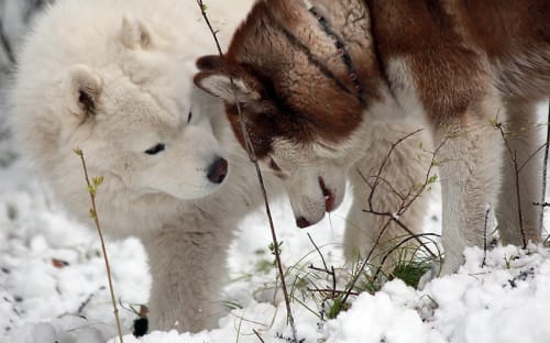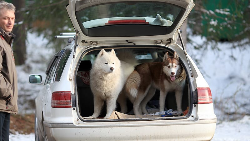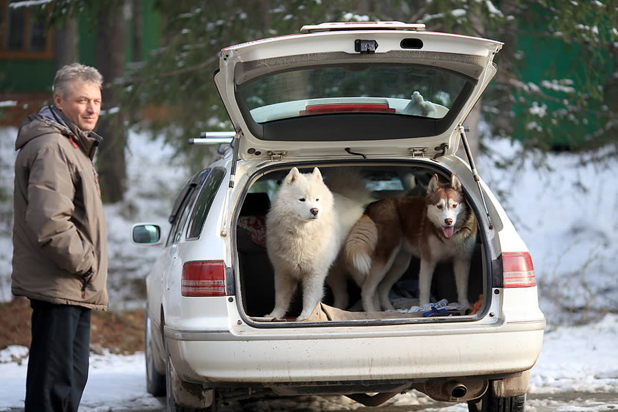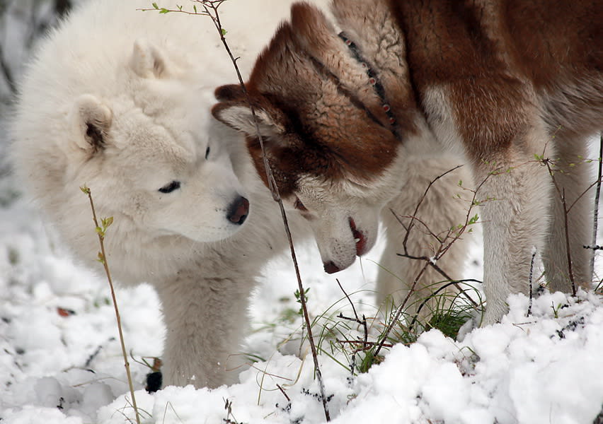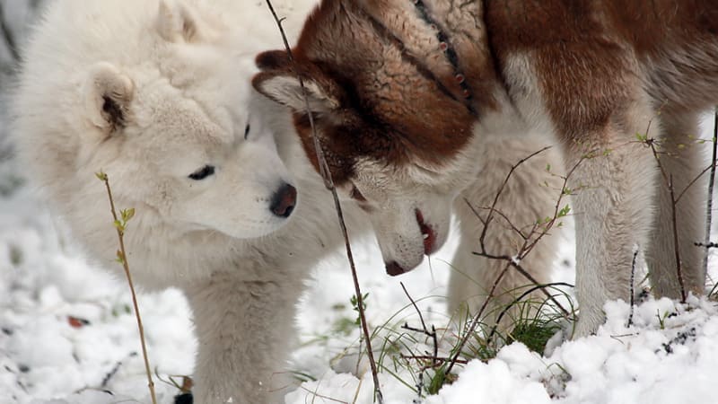 У входа в парковую зону Железногорска-Илимского на меня стремительно мчится белое меховое облако. Дэн, демонстрируя коронную самоедскую улыбку и едва ли не сбивая с ног, летит обниматься и машет хвостом, будто встретил близкого друга, которого давно не видел. Следом подходит знакомиться чуть более сдержанная белоснежная красавица Эмма, а рыжая хаски Триша занята важным делом – высматривает белок на деревьях и не обращает внимания на чужих людей.