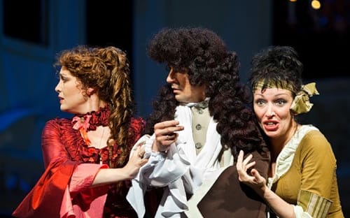 Красоту и стильность спектаклю придали качественно проработанные костюмы. Стилизованные под одеяния времён Мольера, они в то же время были очень современны и модны. Это настоящая большая авторская работа художницы по костюмам Виктории Хархалуп. Интересно было рассматривать всё: и игру фиолетовых оттенков в париках, и тонкие детали кружев на кринолине горничной, и помпончики на скатерти, и струящиеся волны плаща Дамиса, и кокетливый бантик на пышной юбке Марианы, и шикарное красное платье с аксессуарами, которое вдруг улетучивалось и превращалось в новый розовый наряд. А что сказать про грандиозный костюм Короля-Солнца?! Ослепительный, сияющий, королевский.