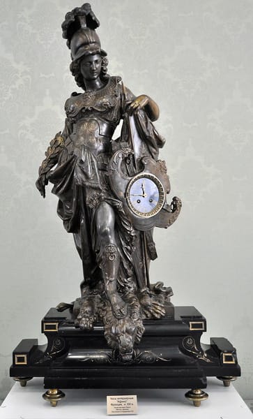 По воспоминаниям внучки Павла Васильевича Курдюкова, Инны, дед привёз эти часы бережно завёрнутыми в пальто. Весит скульптура около 80 килограммов. Бронзовая фигура Афины стоит на мраморном основании. В скульптуру встроен часовой механизм. При поступлении в музей экспонат был датирован ошибочно: в наших архивах сохранилась датировка этих часов – начало XIX века. Декоративное оформление, литьё принадлежит мастеру Пиату (E. Piat), его имя находится на основании скульптурной композиции. На часовом механизме клеймо с надписью «Мужен»(Mougin) и обозначение двух медалей за участие в выставках. Механизм серийного производства, на это указывает номер. Фирма «Мужен» производила часовые механизмы с середины XIX века. Французский скульптор-орнаменталист Фредерик-Эжен Пиат родился в 1827 году и был одним из самых известных бронзовщиков второй половины XIX века. В 1995 году консультации по экспонату давала сотрудник Государственного Эрмитажа, искусствовед, специалист по бронзе Юна Зек. Она считает, что часы принадлежат второй половине XIX века».